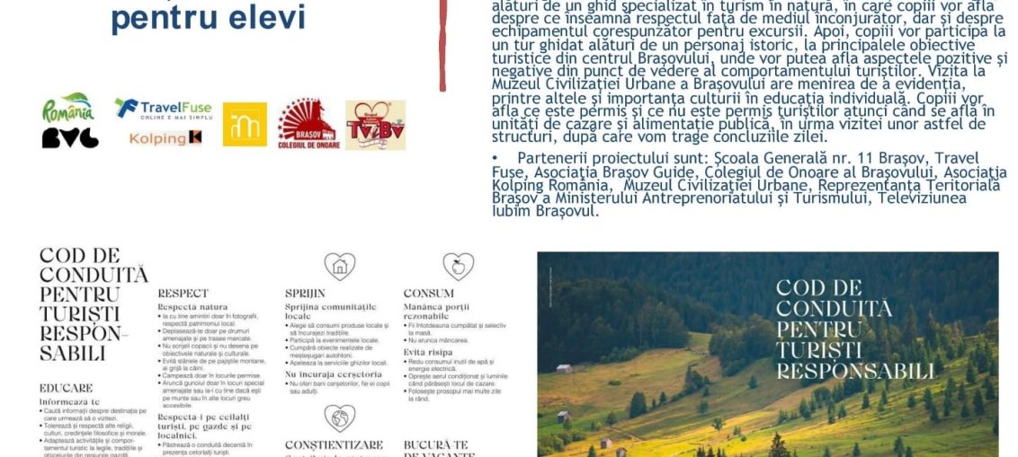 Un grup de elevi de la Școala Generală nr. 11 din Brașov s-au familiarizat cu regulile ”Codului de conduită pentru turiști responsabili”, marți, 25 aprilie, 2023.În cadrul programului copiii au putut afla cum este potrivit să te comporți atunci când vizitezi obiective turistice, muzee, lăcașe de cult etc., când te afli în drumeție pe trasee … Continuă lectura Proiectul de conduită pentru turiști responsabili în rândul elevilor !